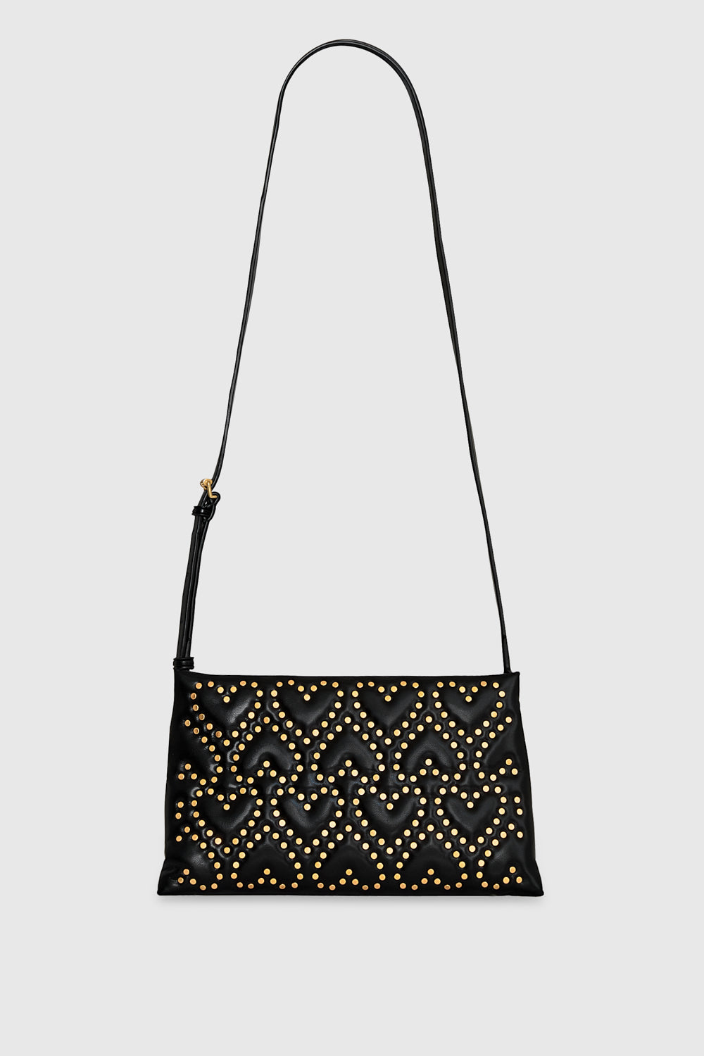 This crossbody bag combines a sleek black silhouette with playful heart-shaped stud patterns in gold-tone detailing. Compact yet roomy enough for your essentials, it features an adjustable strap for versatility and a zipper closure to keep everything secure. It’s the perfect accessory to add a touch of charm with a little edge.