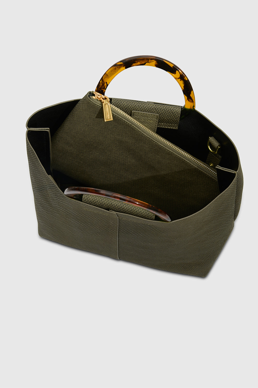 Refined structure meets modern flair. The Square Tote With Resin Handle is a sophisticated statement piece, designed in soft olive colored leather and accented with smooth, tortoise-inspired resin handles. Its clean lines and spacious interior make it the perfect companion for everyday carry—elevated enough for the office, yet bold enough for weekend style.