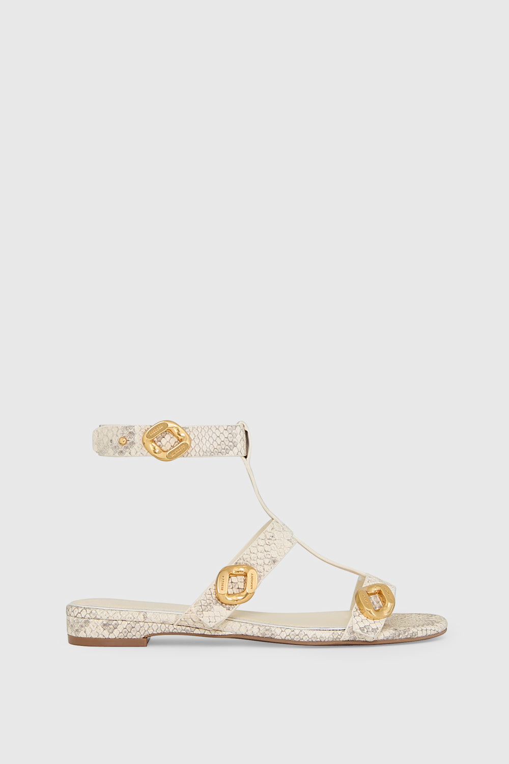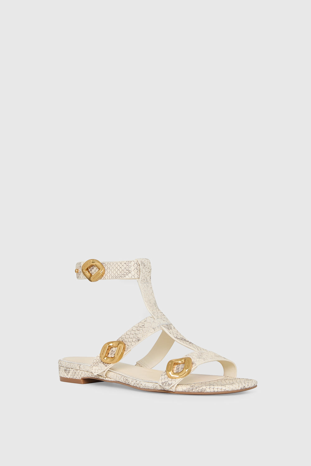 The G Gladiator Sandal features a minimalist flat design with bold curb link buckles for a modern touch. A padded insole and mini wedge heel ensure comfort for every step.